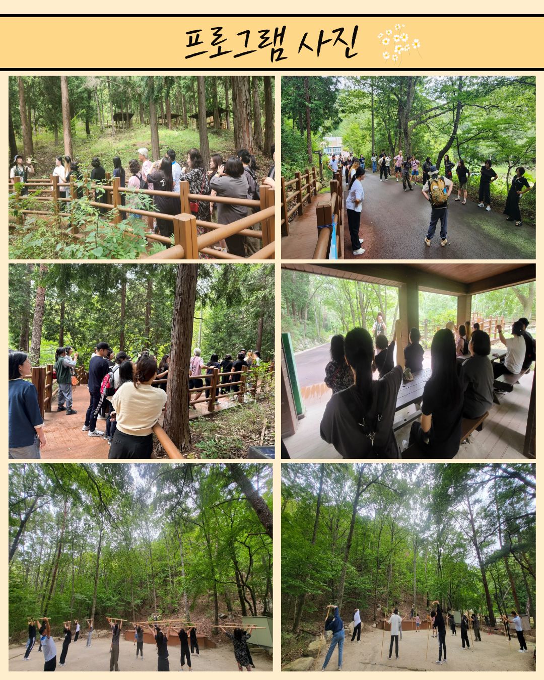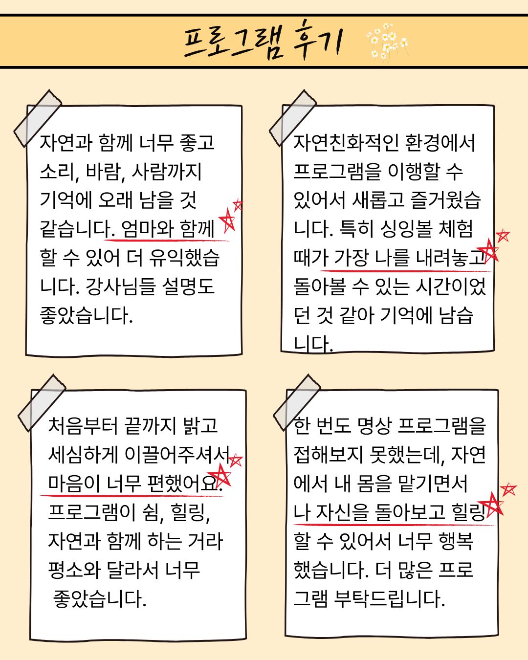 - 자연과 함께 너무 좋고 소리, 바람, 사람까지 기억에 오래 남을 것 같습니다. 엄마와 함께 할 수 있어 더 유익했습니다. 강사님들 설명도 좋았습니다.