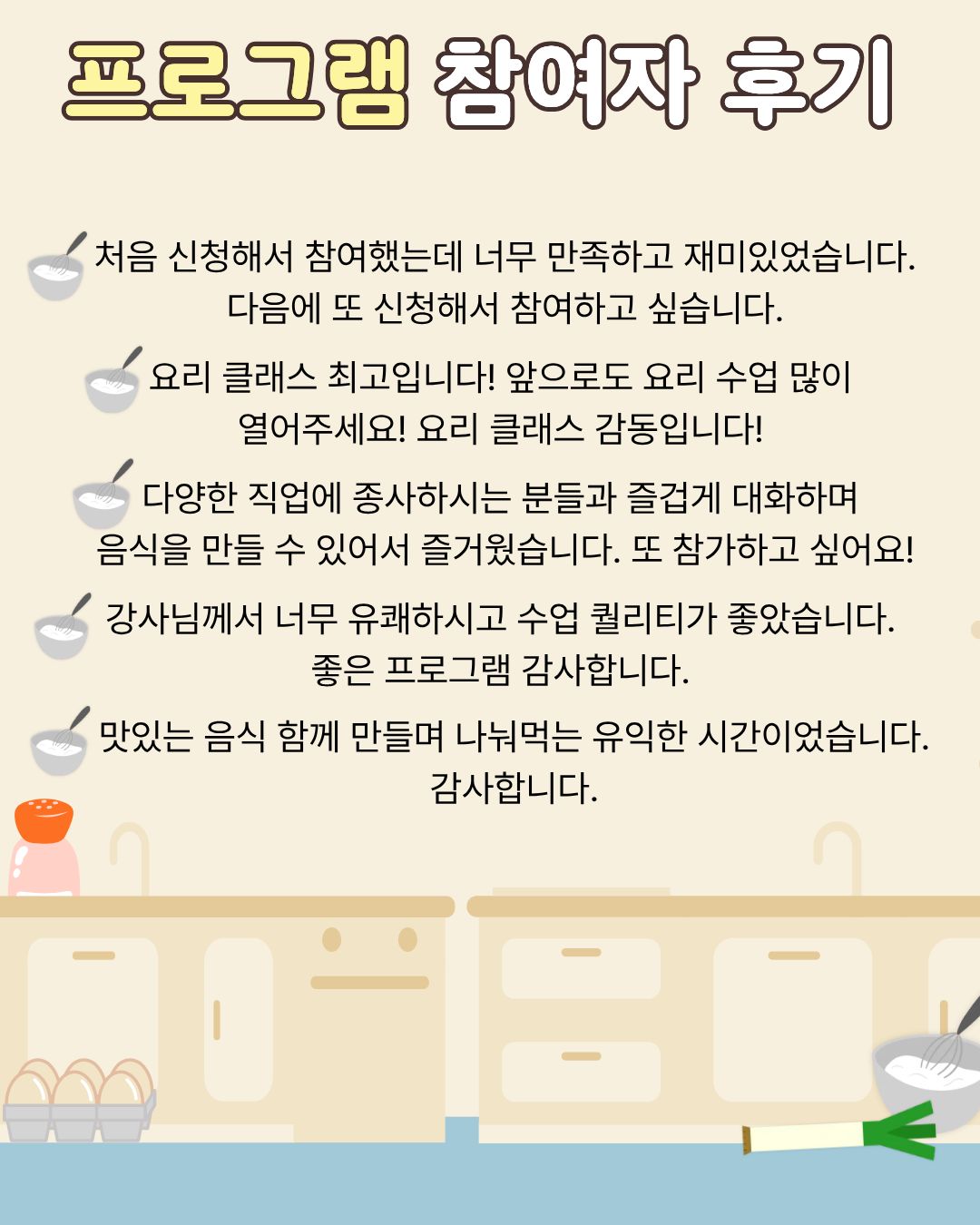 - 요리 클래스 최고입니다! 앞으로도 요리 수업 많이 열어주세요! 요리 클래스 감동입니다!