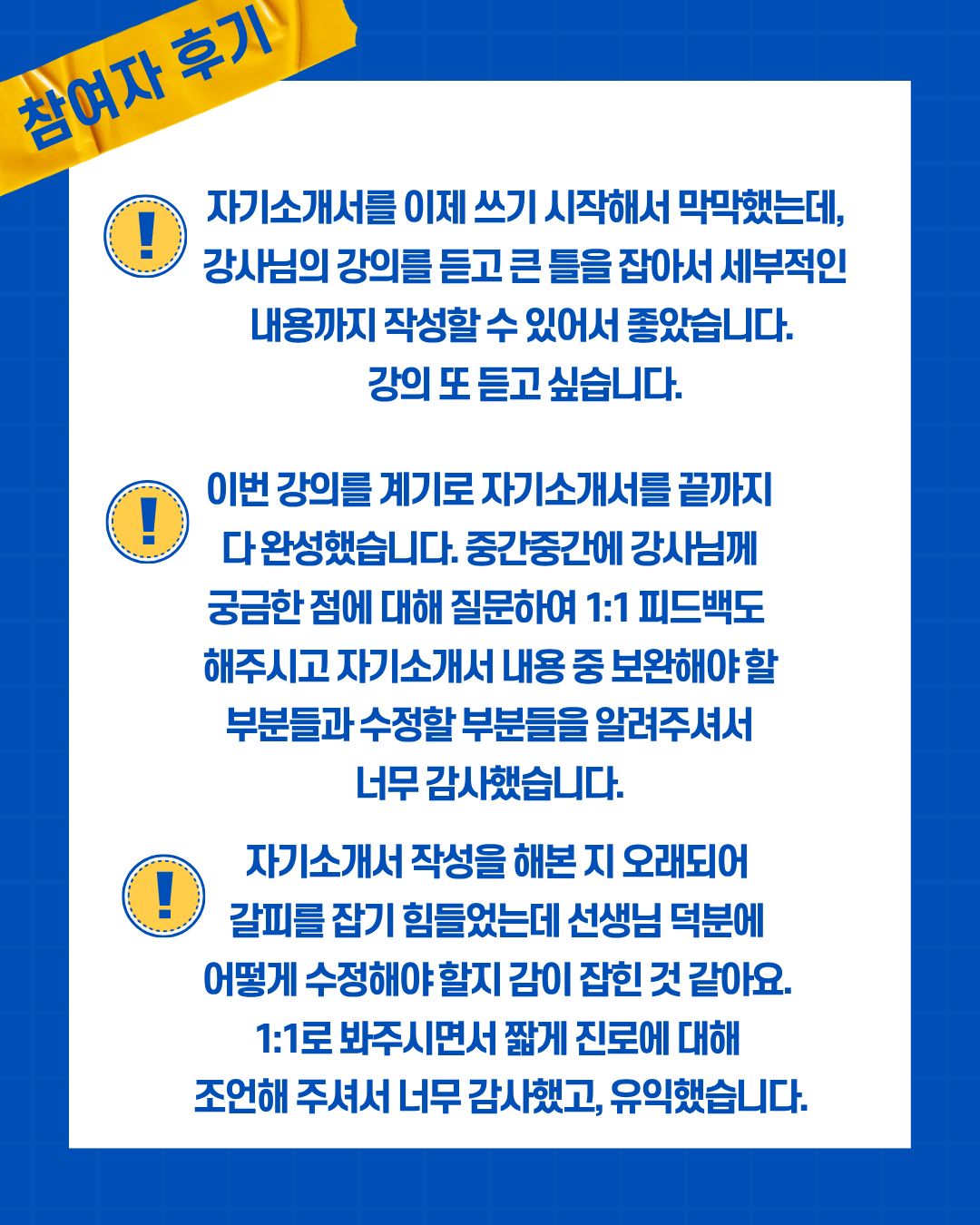 - 자기소개서를 이제 쓰기 시작해서 막막했는데, 강사님의 강의를 듣고 큰 틀을 잡아서 세부적인 내용까지 작성할 수 있어서 좋았습니다. 강의 또 듣고 싶습니다.