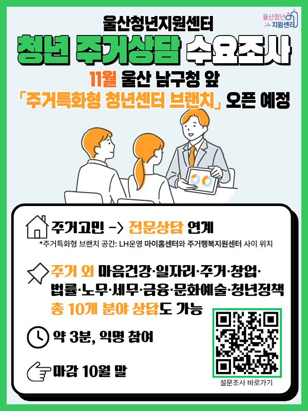 1. 청년 주거상담 수요조사에 참여해 주세요! ✨ 울산 청년들의 주거 고민을 더 잘 듣고, 맞춤형 상담과 지원으로 연결하기 위해 **짧은 설문(약 3분)**을 준비했습니다.