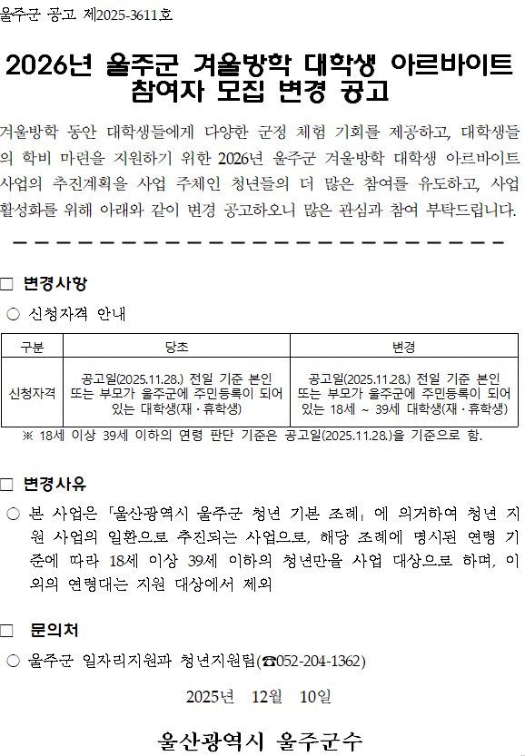 2026년 겨울방학 대학생 아르바이트 모집 변경 공고 안내